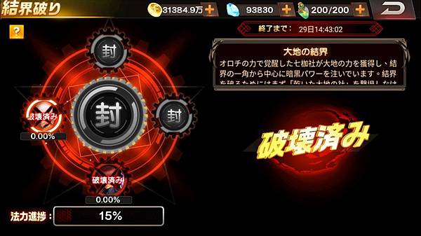 - 「突破結界」分成兩個階段。在第一階段中,需挑戰守護結界的4名中BOSS和1名最終BOSS。BOSS的生命值由全伺服器的玩家共有。成功擊破後,進入第二階段,將消耗抽取進度達100%的法力,挑戰結界突破。