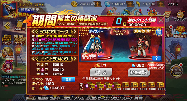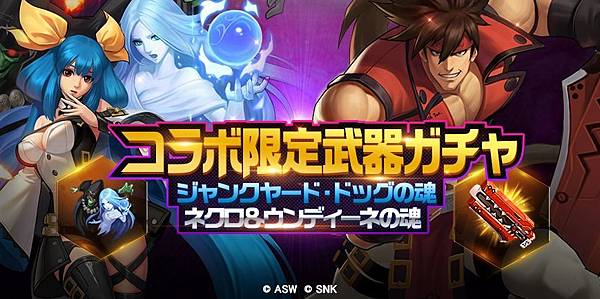 活動內容:(1) 可透過聯名活動期間限定的「裝備寶箱」獲得LR格鬥家「索爾巴格」或「蒂姬」! (2)「裝備寶箱」開啟一定次數,即可獲得「索爾巴格」或「蒂姬」的頭像或萬能碎片。 (3) 抽將積分進入高分排行,可獲得「GG聯名二選一格鬥家碎片」 (「索爾巴格」或「蒂姬」) 300片